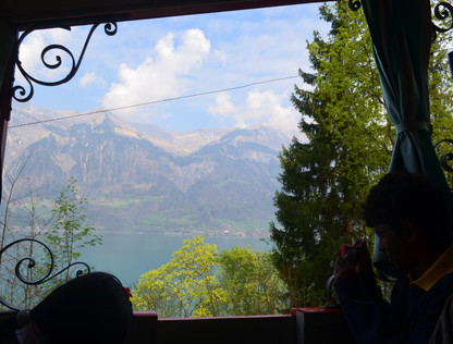 Cruising the Brienzersee (lake Brienz) was scheduled. Ferry ride on this lake came 'free' with the SWISS PASS. A one way ride would take about 1 hour and 15 minutes with a few stops in some pretty villages on the way. We boarded the typical Swiss ferry and were soon amidst bright green waters. The boat had an open deck and also a roofed cabin with an in-house restaurant. Polished, shiny wooden furniture adorned the indoors. We were impressed with both the indoor and outdoor seating capacity. Passengers were free to occupy any area on the ferry. We were happy with the wooden bench type seating arranged on the deck, open to the sky, offering views of the beautiful Swiss Alps & villages, that flanked either banks of the Lake. We drifted at a medium pace.