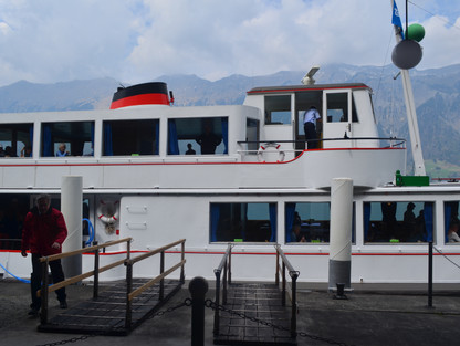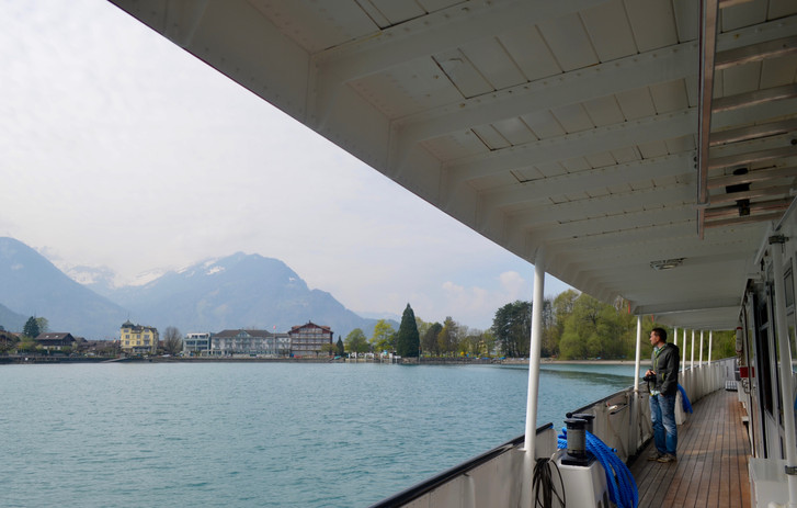 The thought of witnessing "Switzerland in a summarised form", dragged us to this place. It was more of a leisure start that morning in comparison with the other hectic days of the tour. It was also our last day in the beautiful country. The bright, sunny day began with boarding a train from Interlaken west to get to Interlaken Ost. At a two minute walking distance from this station, is the ferry terminal above the river AARE. Though this river originates and ends in the country covering many parts, it flows in narrow, winding channels throughout Interlaken, merging with Lake Thun on the west and Lake Brienz on the east.