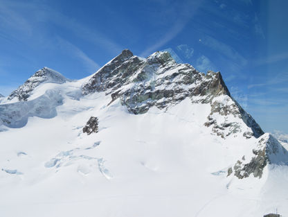 The Kleine Scheidegg is a mountain pass, which is the entry point to reach the majestic Jungfraujoch. Our train gradually climbed heights crossing the massive, rocky, mountain tunnels, cutting through the EIGER and MONCH ranges in great speed. The Eiger mountain stands at around 3900 metres while the Monch arches above it, at 4110 metres. Towering over both these ranges in continuity, is the Jungfrau mountain. As we sped through pitch darkness, lights came up illuminating the interiors of the train. We felt blocked ears due to the rising altitude and elevation. It was a fantastic night experience in broad daylight. There were short stops at the tunnel stations of both Eiger & the Monch.
