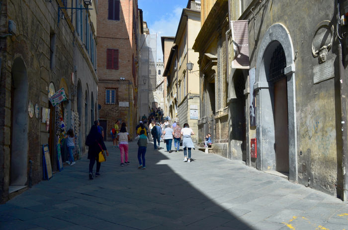The group gathered around the crowded square while staring in awe at the gothic buildings & surroundings. A special lady guide took over from our tour guide, instructing the group to use their given head phones to enjoy her narratives. Nearly half an hour passed in this square as she poured precious information into our ears. I was free to walk around and click pictures while simultaneously listening. The following is in an attempt to summarise the historical significance of this square, which can otherwise occupy an entire page. Flanked by three of the erstwhile Palace buildings of Tantucci (yellow coloured), Salimbeni (white coloured) and Spannocchi (beige coloured) is the 'Salimbeni Square' that wears a crown for hosting one of the oldest, yet currently functioning banks in the world - the "Banca Monte dei Paschi di Siena". The Salimbeni family, belonging to the papal line, were imperial tax collectors who set up few of their offices on a lane leading to this square. In the early 15th century, their downfall led to the entire activity being taken over by a single credit institution, that gradually progressed into a bank as we see it today. It is housed in the Salimbeni fortress (central white building in the square). The centre of the square adorns a full sized, noteworthy white sculpture of a Sienese economist-cum-priest Sallustio Bandini, standing on an octagonal pandal built in step form. The sculpture was completed nearly a century after Bandini death. Born to a distinguished local family, the highly influential Bandini was known for his advocation of free trade & fight against undue tolls and levies. In addition, his donation of an entire personal library of nearly 3000 works, to a local university, for public usage, turned him a local hero. The beige coloured palace Spannocchi standing to the right, bears a resemblance to MEDICCI PALACE in Florence ( read FLORENCE). The guide invited our attention to the top portion of its facade that bore uniform arches. The twelve sculpted heads that stuck out here, were those of various Roman emperors and noted people. The art work, sculpture and designs around the square scream out their true Italian nature.