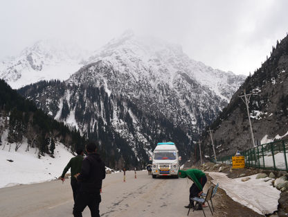 Continuing on our journey, we crossed a path next to which river Sindh gently made a flow. The entire scene had changed by now. The yellow and green slowly turned into browns and whites. The first sights of snow, was our very first. We were ecstatic ! Younis could easily say it was our first time of experiencing snow by our behaviour.