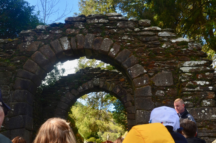 Our next stop was at the famous, prehistoric, monastic city of GLENDALOUGH. Set in the glacial valley, right inside the WICKLOW MOUNTAINS NATIONAL PARK, is the ancient monastic city of Glendalough. It is as old as 6th century. The place attracts a lot of visitors throughout the year due to its walking trails, deep history & couple of swell lakes. From the moment we set foot here, it was pure bliss. The surroundings were filled with pure oxygen, we could feel it in our lungs. We walked behind the guide, who led us through the main double arched, stone gateway to the monastic city, the roof of which was in dilapidated.